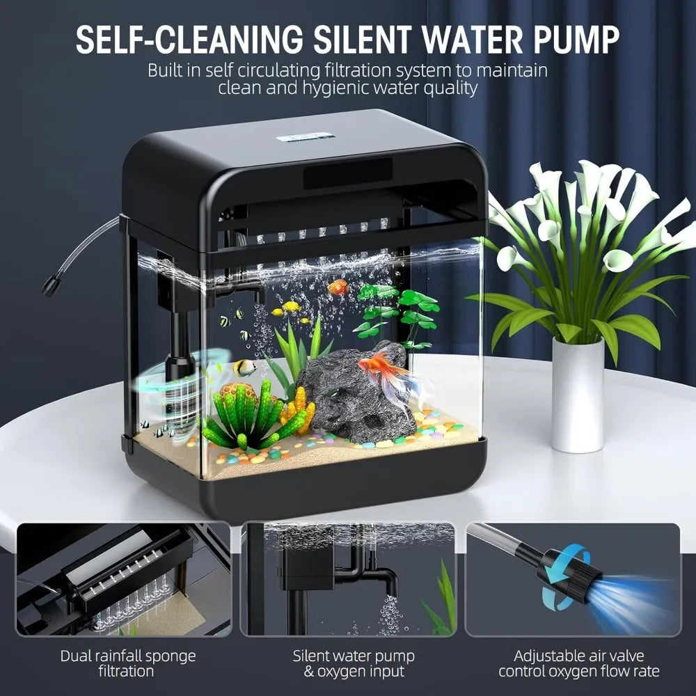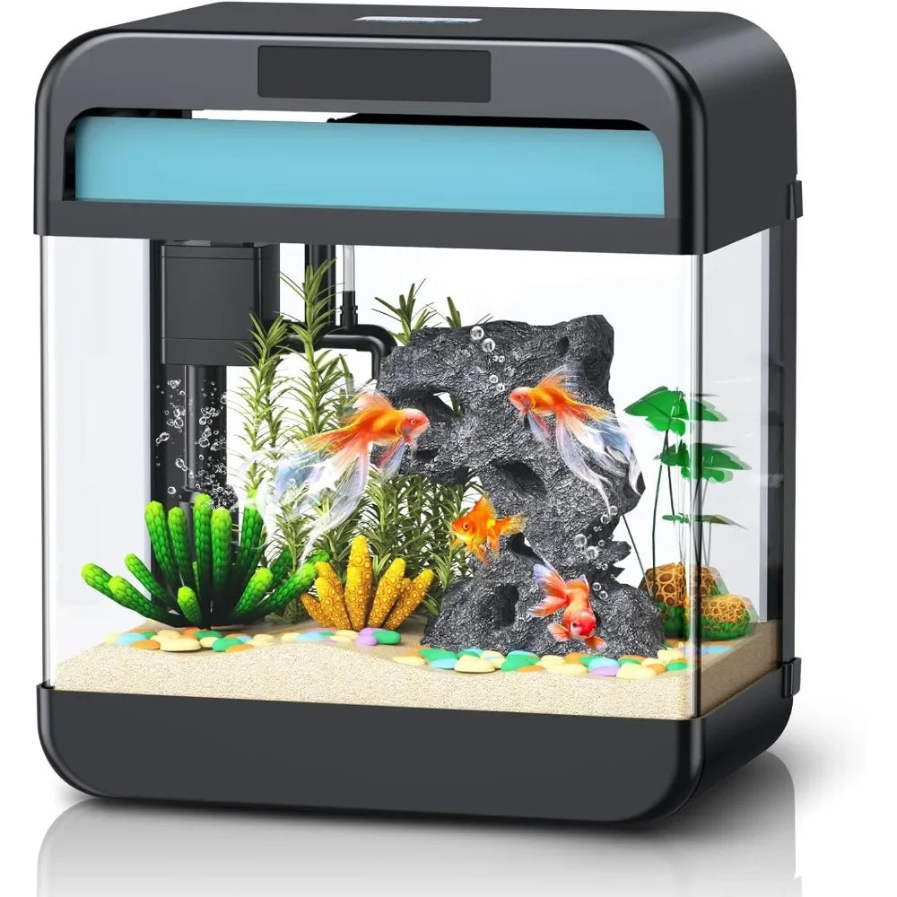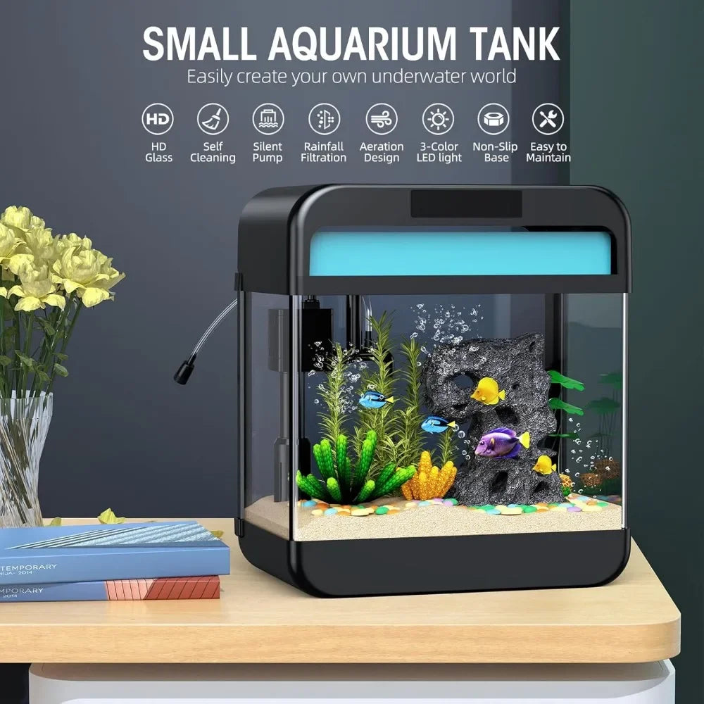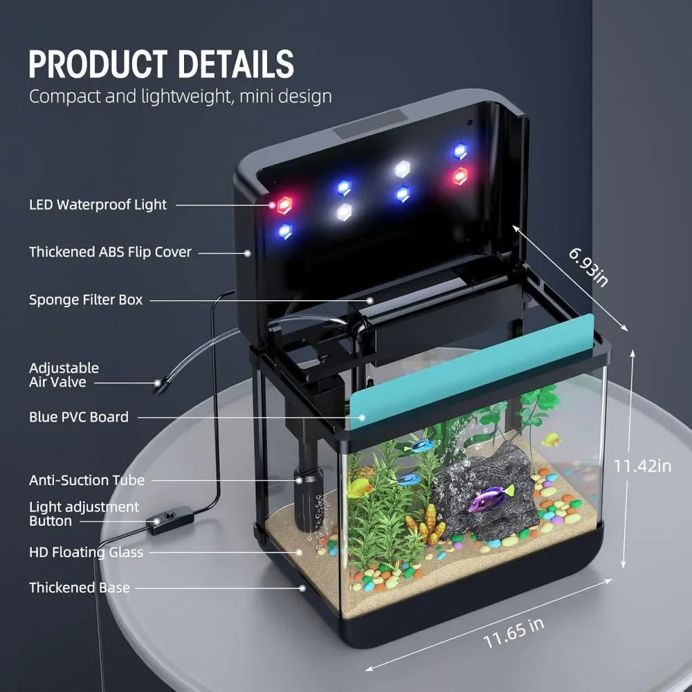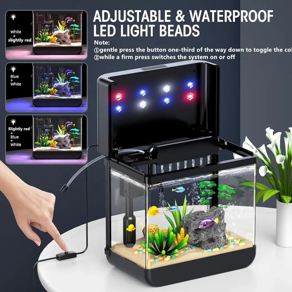 Create a stunning aquatic display with this 2.2 Gallon Fish Tank Aquarium featuring adjustable 3-color lighting. Ideal for small fish or aquatic plants, this compact aquarium provides a peaceful and vibrant environment for your aquatic pets. The tank includes an energy-efficient LED lighting system with three color options—white, blue, and multicolor—allowing you to set the perfect ambiance. The sleek, modern design fits seamlessly in any space, whether on a desk, countertop, or shelf. Easy to set up and maintain, it includes a filtration system that ensures clean and clear water.